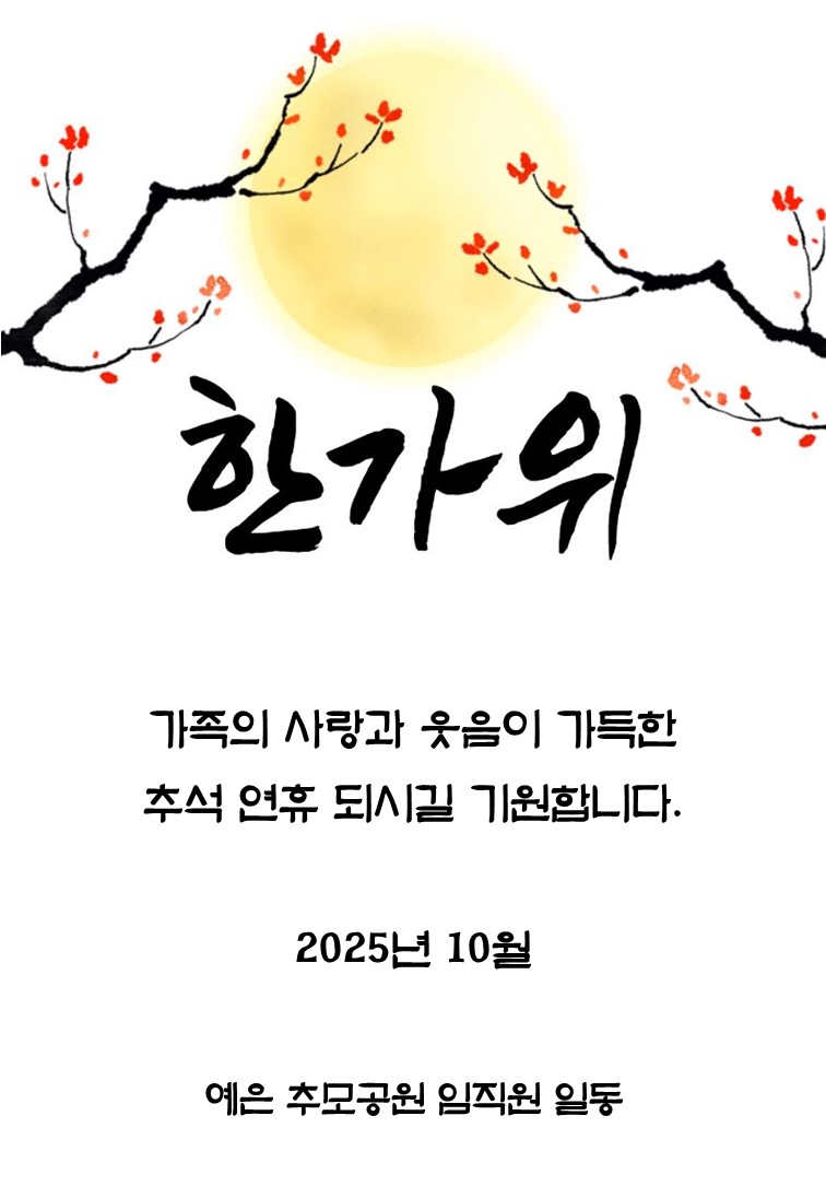 2025년 한가위 인사드립니다 페이지 정보 작성자 관리자쪽지보내기 메일보내기 자기소개 아이디로 검색 전체게시물쪽지보내기 메일보내기 자기소개 아이디로 검색 전체게시물 댓글 0건 조회 397회 작성일 25-10-03 10:40 수정 목록 본문 풍성한 한가위처럼 마음도 넉넉해지는 명절 보내시길 바랍니다.감사합니다. 댓글 0 댓글목록 등록된 댓글이 없습니다.