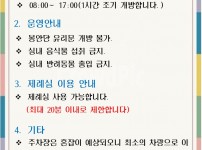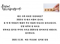 2025년 구정 연휴 운영 안내문 페이지 정보 작성자 관리자쪽지보내기 메일보내기 자기소개 아이디로 검색 전체게시물쪽지보내기 메일보내기 자기소개 아이디로 검색 전체게시물 댓글 0건 조회 890회 작성일 25-01-15 09:32 수정 목록 본문 구정 연휴 안내문입니다.이용에 참고바랍니다. 댓글 0 댓글목록 등록된 댓글이 없습니다.