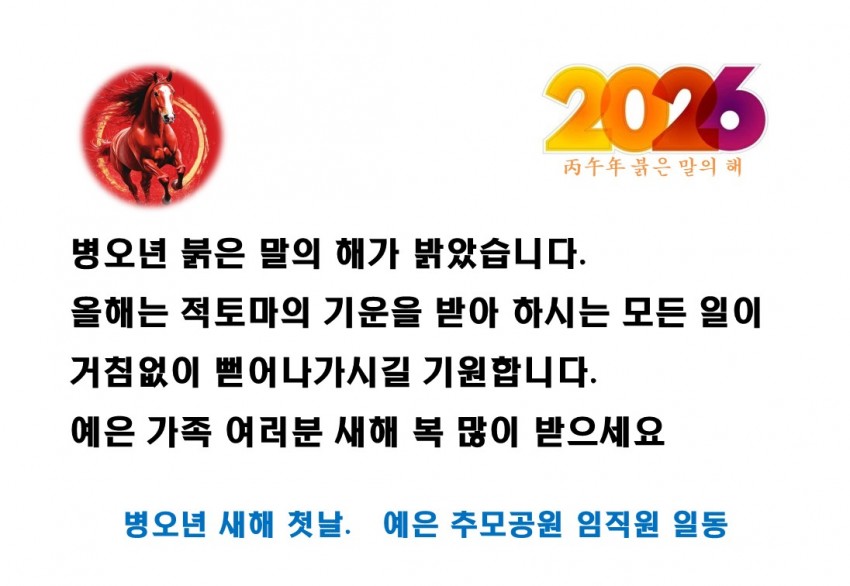 예은 가족 여러분 새해 복 많이 받으세요 페이지 정보 작성자 관리자쪽지보내기 메일보내기 자기소개 아이디로 검색 전체게시물쪽지보내기 메일보내기 자기소개 아이디로 검색 전체게시물 댓글 0건 조회 246회 작성일 26-01-01 09:14 수정 목록 본문 2026년 행복한 한 해가 되길 기원합니다.감사합니다. 댓글 0 댓글목록 등록된 댓글이 없습니다.